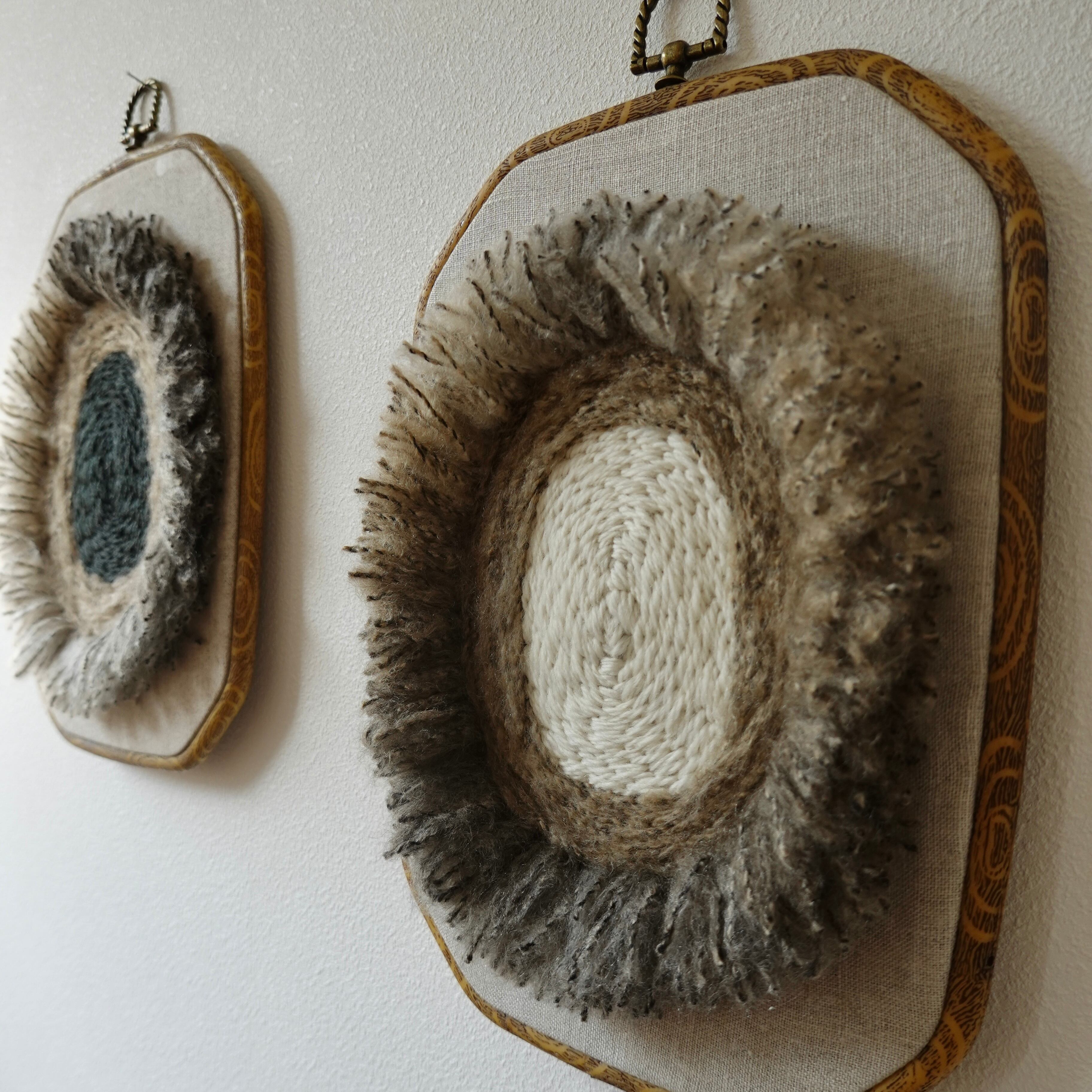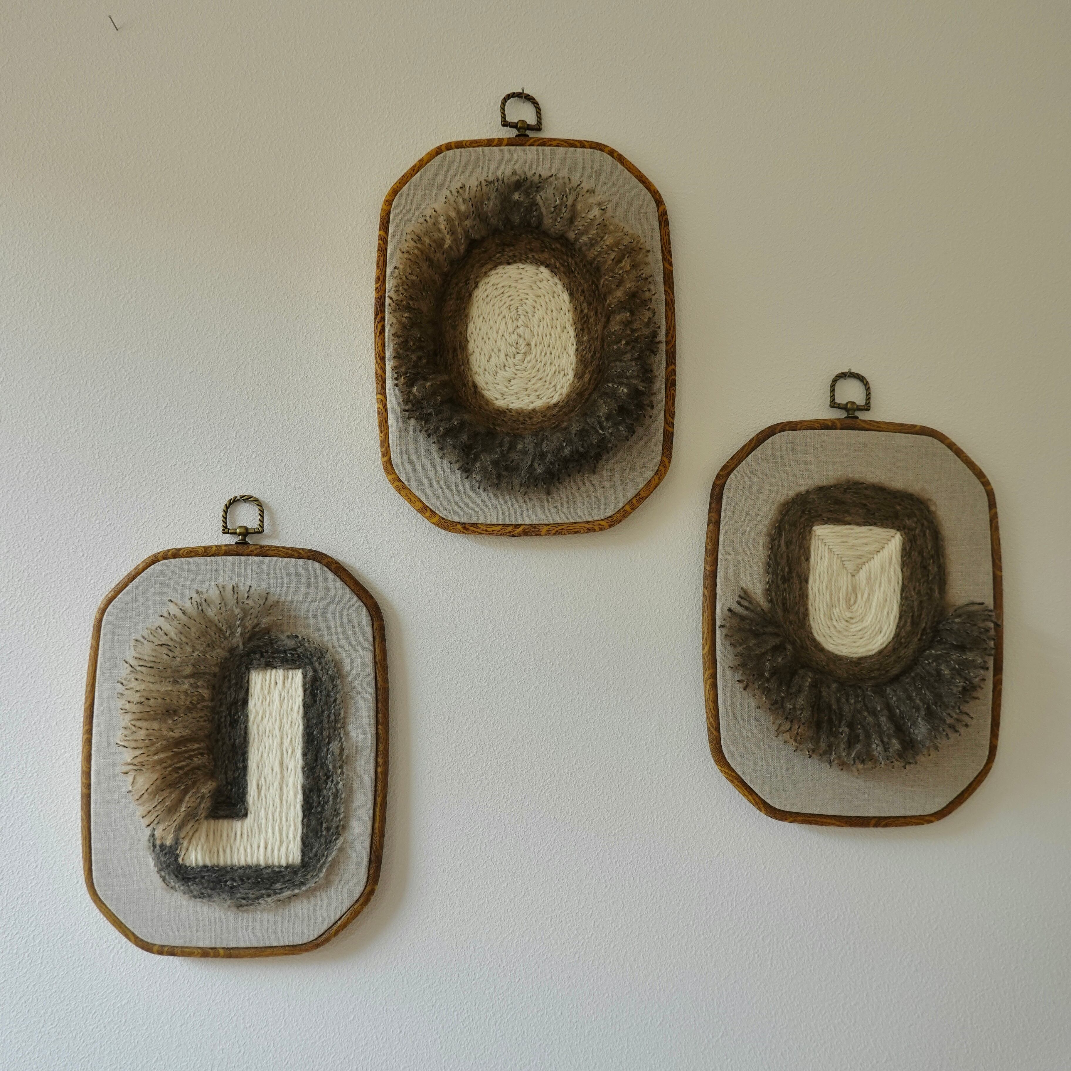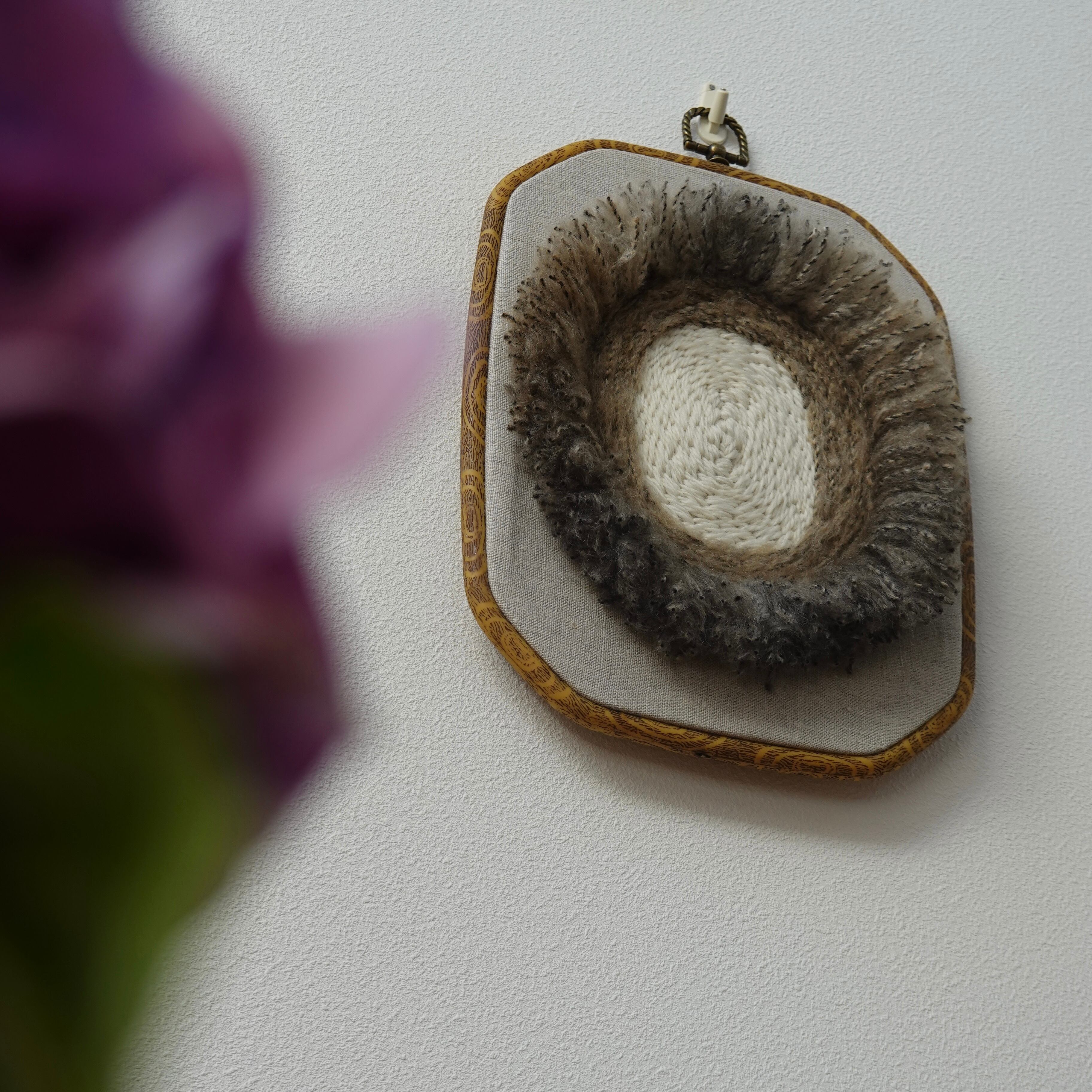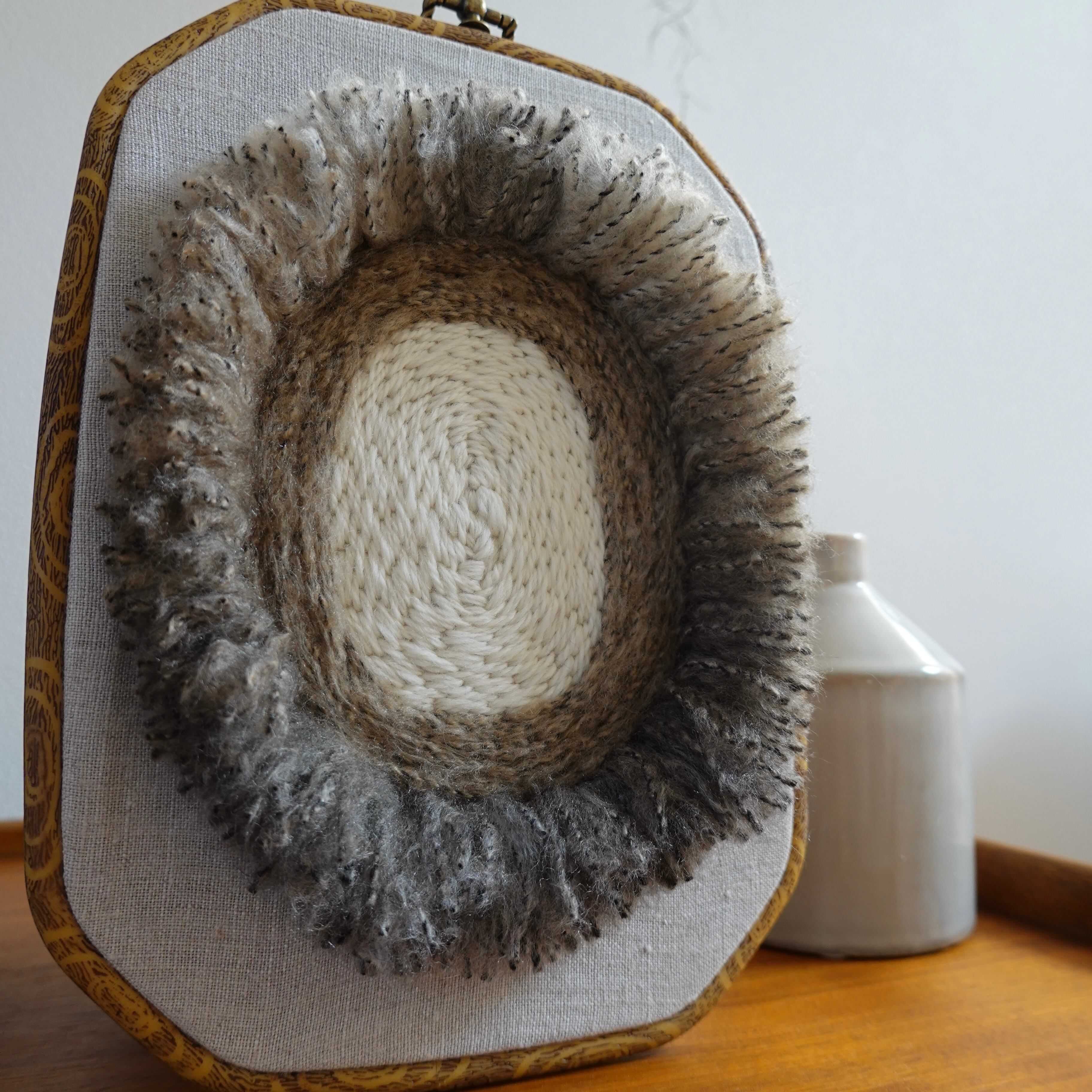 リネンの生地に毛糸で刺繍をしています。
